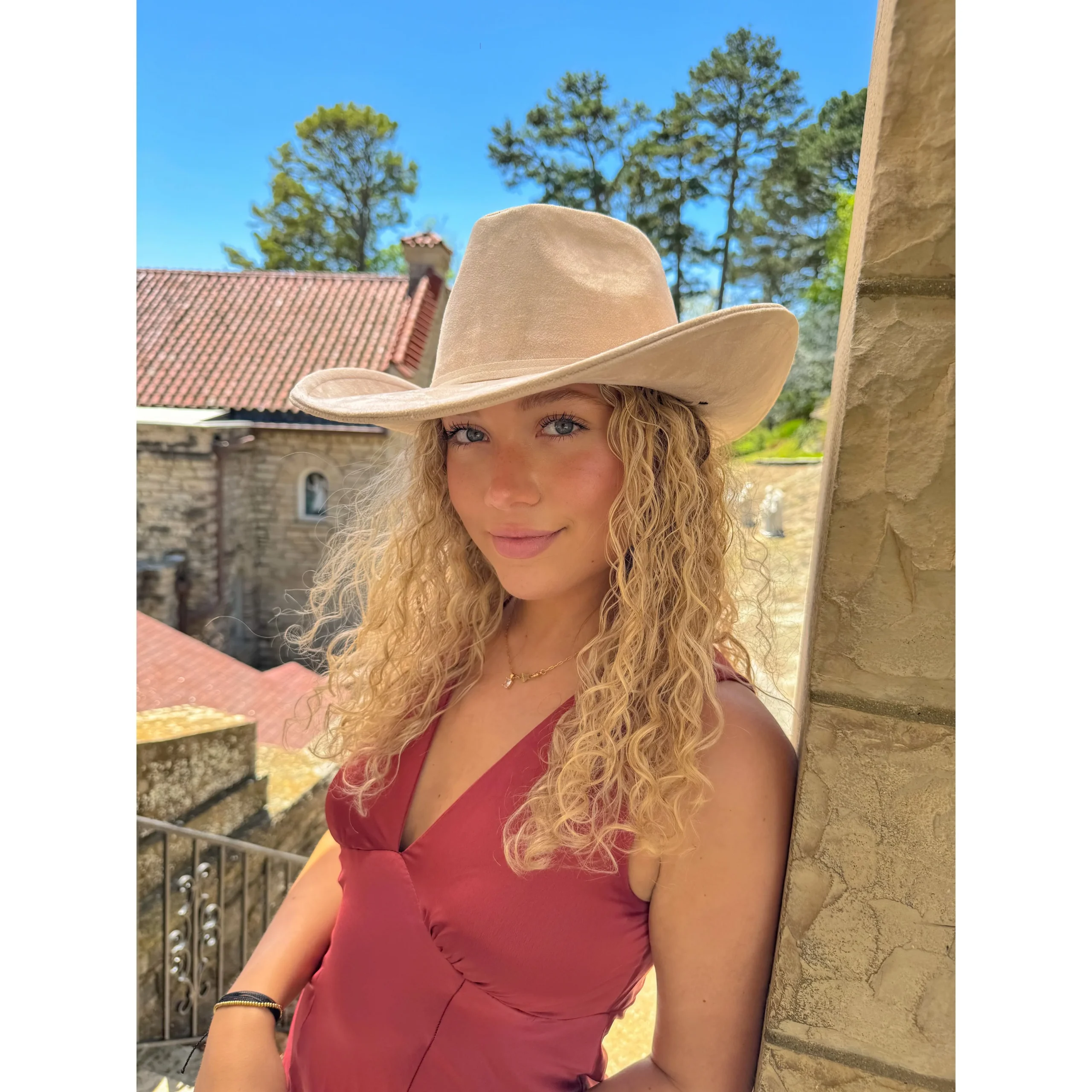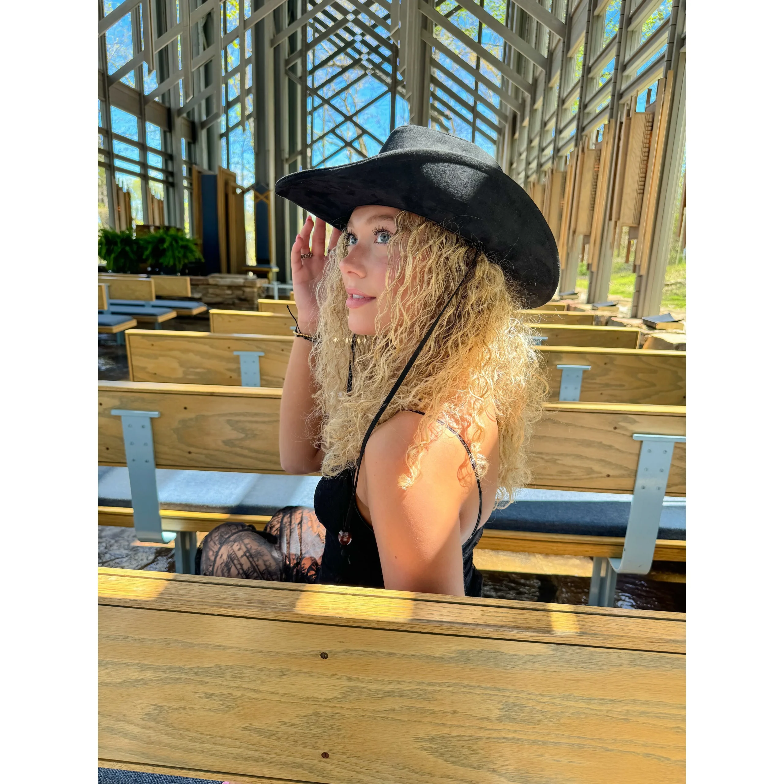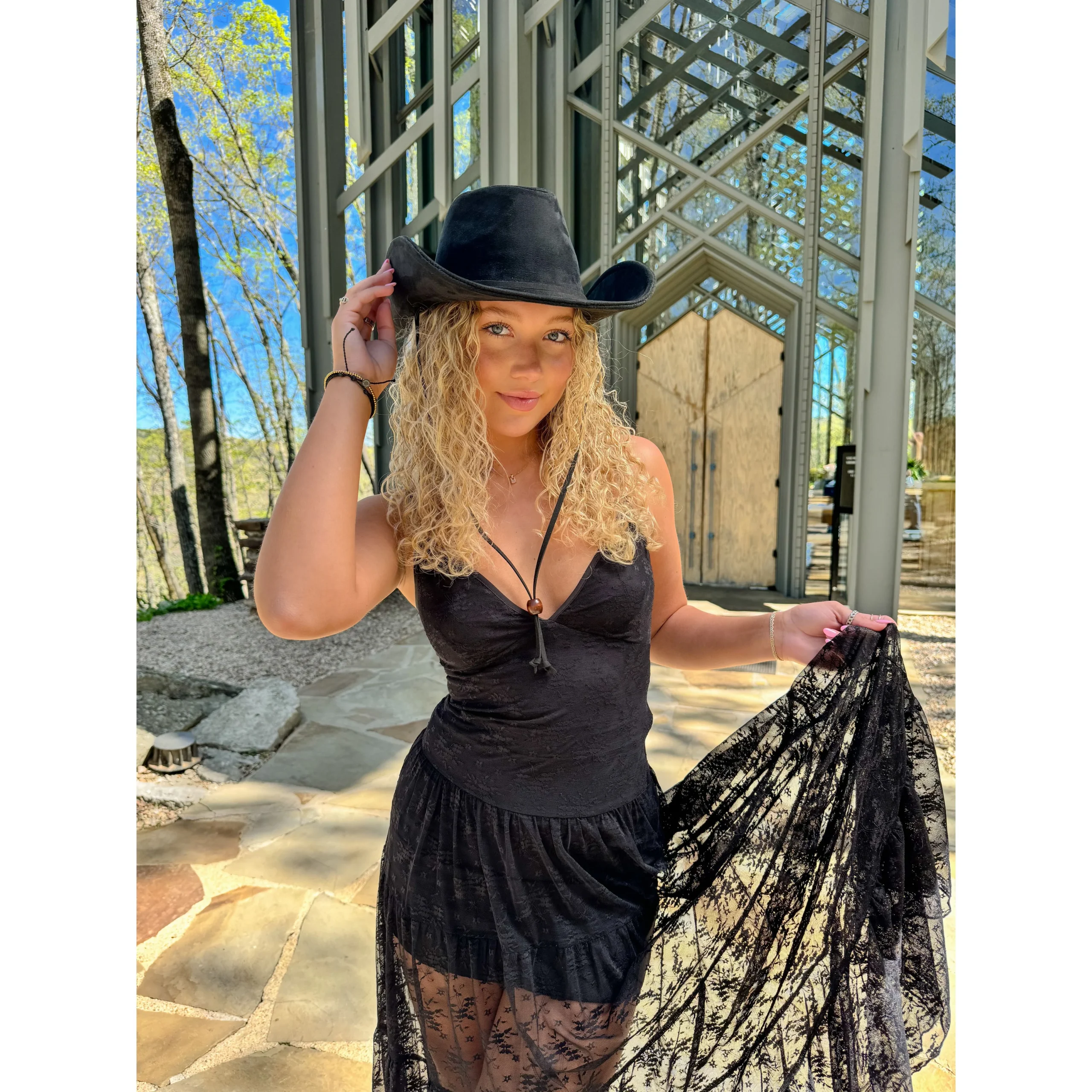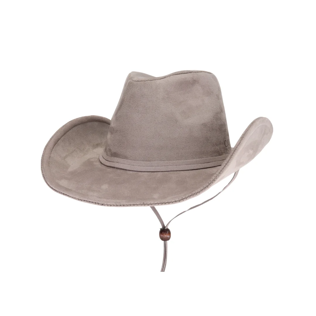 This cowboy hat has a faux suede design, adjustable strap and our logo burned into the side. This is a staff favorite!